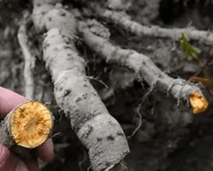 You may be able to recognise the knotweed from its roots and rhizomes, these are shown below, they are dark brown with a yellow centre. remember to take caution, as even 1cm of rhizome or root can sprout a new plant.